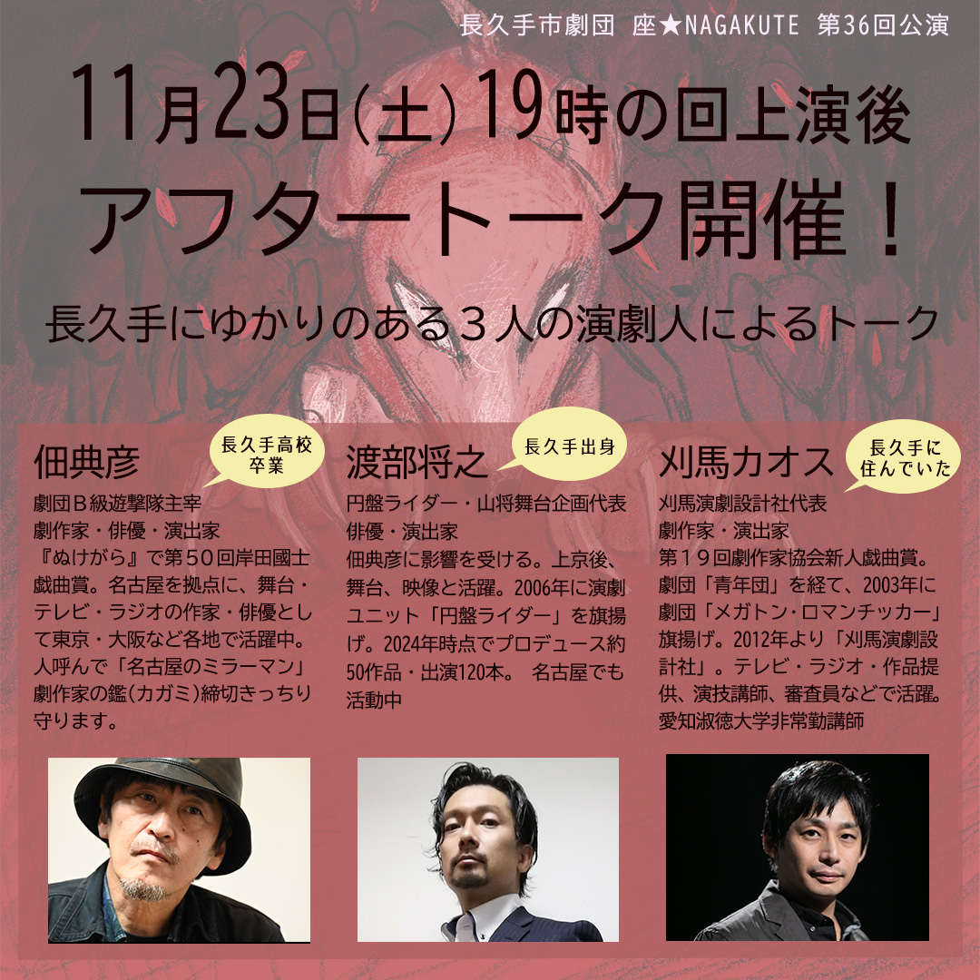 さて、23日19時の回の終演後に、作・演出の佃さんとゲストお二人によるアフタートークを開催します!